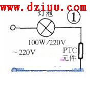 準備一支100W的白熾燈和帶電源插頭導線一根。燈泡、PTC元件串聯接成如圖1