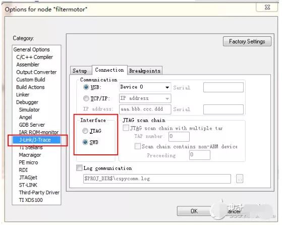 3、如果你的仿真器支持SWD仿真模式,如IAR下用JLINK、MDK下用ULINK2。 直接將仿真器的模式設為SWD模,就可以不受這個禁止JTAG功能的影響了。