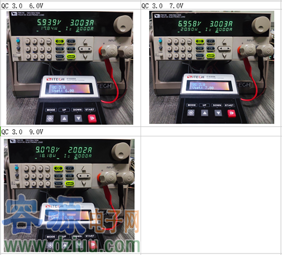 2.1、在QC3.0模式下,誘導適配器輸出6.0V、7.0V、8.0V、9.0V,分別使用電子負載恒流模式拉載,測試其電壓、輸出功率。