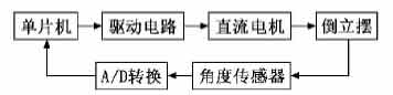 倒立擺控制系統結構框圖如圖2所示,單片機(51單片機)為控制器,直流電機為執行器,倒立擺為被控對象,倒立擺角度為被控量,角度傳感器和模數轉換器構成反饋回路。