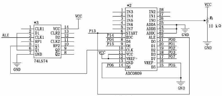 A/D轉換器的時鐘脈沖為單片機ALE引腳輸出的脈沖經74LS74芯片分頻之后得到,A/D轉換器的8位數字信號通過單片機的P0口進行采集與處理。