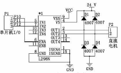 圖5中,L298N的ENA為使能端,可作為單片機PWM(脈寬調制)控制端,控制直流電機轉速;IN1和IN2為信號輸入端,OUT1和OUT2為輸出端,輸出