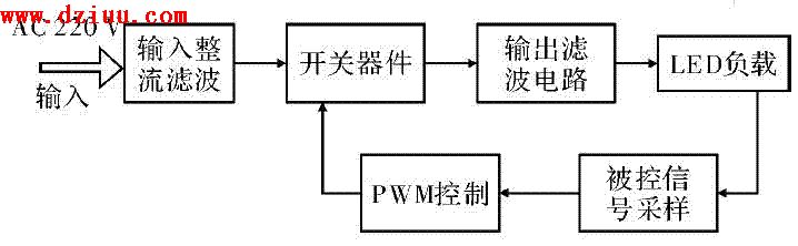 可以做到80% ~90% 。該類電路都有完善的保護措施,屬高可靠性電源。PWM 開關電路由4 部分組成,即輸入整流濾波、PWM 控制、開關器件和輸出濾波。根據PWM 方式開關電路設計的LED 驅動電路框圖如圖1
