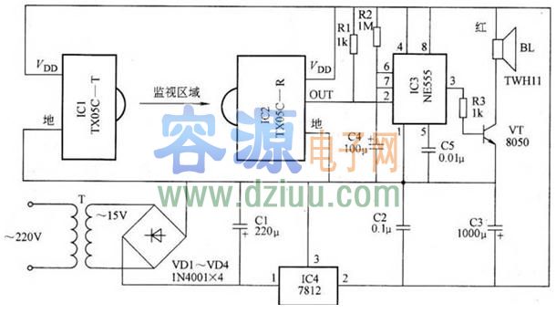 ,其電路主要由紅外發(fā)射和接收模塊、時基集成電路、報警揚聲器及電源電路幾部分組成。 <<版權聲明:本文由容源電子網(wǎng)(www_dziuu_com)整理提供,部分內(nèi)容來源于網(wǎng)絡,如有侵犯到你的權利請與我們聯(lián)系更正。》