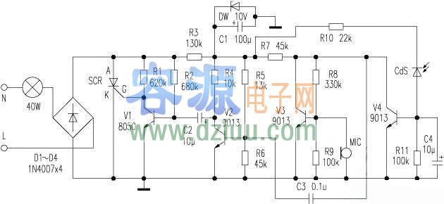 聲光控開關電路圖 <<版權聲明:本文由容源電子網(www_dziuu_com)整理提供,部分內容來源于網絡,如有侵犯到你的權利請與我們聯系更正。》