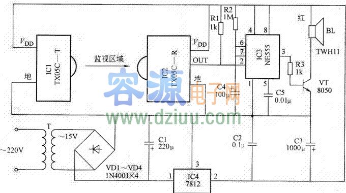 ,其電路主要由紅外發射和接收模塊、時基集成電路、報警揚聲器及電源電路幾部分組成。 《版權聲明:本文由容源電子網(www_dziuu_com)整理提供,部分內容來源于網絡,如有侵犯到你的權利請與我們聯系更正!