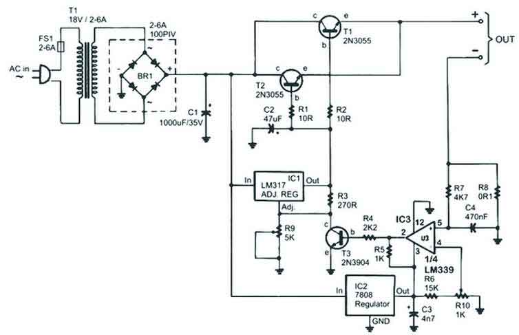 功率晶體管T1和T2的串聯(lián)連接,用于管理電池充電器的輸出電壓和充電電流速率。LM317可調(diào)電壓調(diào)節(jié)器將驅(qū)動(dòng)信號(hào)提供給功率晶體管T1和T2的基極。R9電位器設(shè)定輸出電壓電平。然后,R8用作電流采樣電阻,它連接在負(fù)輸出引線和電路接地之間。對(duì)于流經(jīng)R8的每個(gè)充電電流Amp,在其上產(chǎn)生100mV輸出。R8兩端產(chǎn)生的電壓饋入比較器IC3的一個(gè)輸入端。比較器的另一個(gè)輸入端是連接可變電阻(R10)。