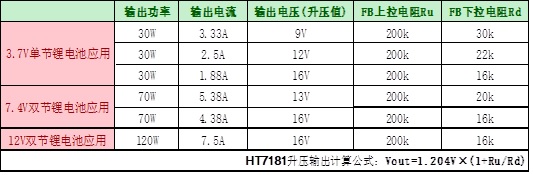 單節/雙節/三節鋰電池應用升壓輸出電壓/電流/功率以及對應FB管腳設置電阻值: