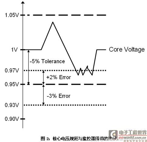 許多廉價的電壓監控器集成電路通常有一個被忽視的負作用,對于電壓變化,監控器的閾值將影響整個系統的容差。圖2說明了這種情況。核心電壓的規格為1V+/-5%,如果CPU核心電壓低于0.95V,就要求監控器必須發出一個中斷信號。然而,考慮到監控器的閾值精度,電壓變化的整個容差降低了。在這個例子中,該監控器的閾值為0.95V+2%/-3%(0.97V至0.93V)。采用這種監控集成電路時,該閾值應設置成0.97V ,這就限制了DC/DC轉換器的容差。