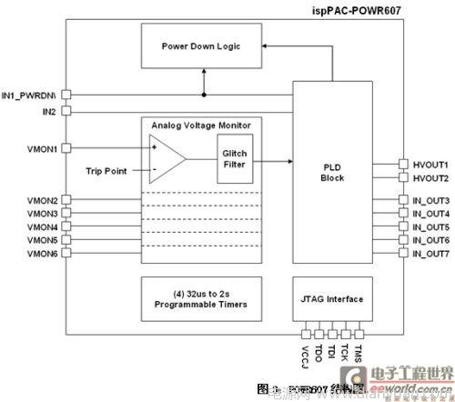 Power Manager II POWR607器件的6個電壓監控器(VMON)都是獨立可編程的。斷點比較器提供192可編程點,整個范圍為0.667V到5.811V。當電源關閉之后,每個都提供一個75mV零檢測選擇,以確定電源輸出是否已經衰退到無效的情況。如果被監測的電壓大于斷點設置,每個比較器輸出一個邏輯高電平至可編程器件塊。比較器提供設定點的滯回約1%,以減少由電路板引入的輸入噪聲造成的誤觸發,以及由于開關電源而引起的正常電源紋波。過電壓和欠電壓電壓斷路點是可編程的,反映了被管理的DSP/FPGA/微機的容差。每一個電壓監控器提供一個數字濾波器,可以延時比較器的輸出,以避免假的觸發條件。針對CPU的看門狗定時器功能,該器件提供一個內置的振蕩器和可編程定時器電路,設定時序間隔范圍為32微秒到2秒。