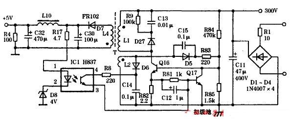 ,該輸出電壓經R17,光耦器發光二極管使穩壓管D8擊穿,光耦器初次級