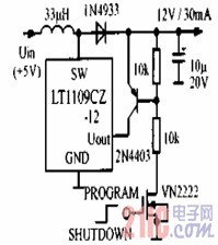 3V/12V DC/DC變換電路:LT1109為三端器件,沒有關閉電源控制端。若外接一些元件可組成有關閉功能的電路。FET的柵極為低電平時,電源關閉,靜態電流等于零。 :