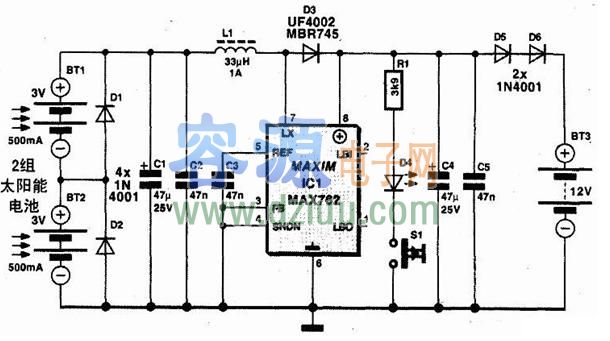 要供電MAX762升壓變換器lCl。762是MAX761(1 2V輸出)系列的15V輸出型,在這里用于將6V提升到1 5V。C1和C2是去藕電容,抑制開關型穩壓電源lC產生的高低頻雜散干擾成分。采用肖特基二極管D3,能量以磁場的形式存貯在電感L1中。 <<版權聲明:本文由容源電子網(www_dziuu_com)整理提供,部分內容來源于網絡,如有侵犯到你的權利請與我們聯系更正。》