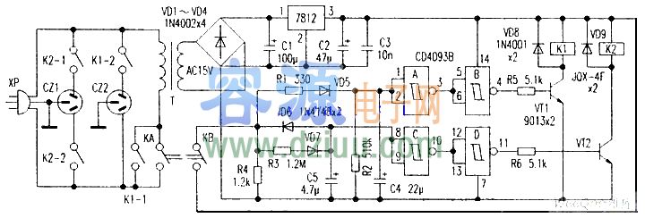 與非門CD4093B用于對C4、C5的充放電電壓進行整形,防止在高、低電平處于臨界點時造成K1、K2觸點抖動。CZ1、CZ2的通電時間間隔由R1、C4及R3、C5的時間系數決定,而