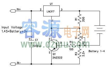 減少LM317的損耗,輸入電壓設置在比輸出電壓高3V,如1.45×4+3 約9v,容-源-電-子-網-為你提供技術支持