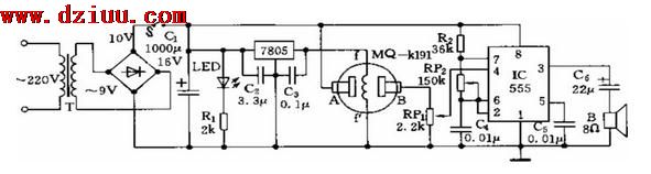 ;當(dāng)QM型器敏元件檢測到可燃?xì)怏w或煙霧時(shí),A—B極間的阻值降低,使4腳電位上升,使得555起振。并通過3腳輸出端驅(qū)動(dòng)蜂嚀器發(fā)出報(bào)警聲。