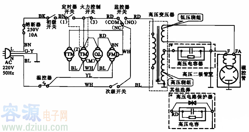所示為定時(shí)器控制式微波爐的工作原理圖。高壓變壓器、高壓整流二極管、高壓電容器和磁控管是微波爐的主要部件。