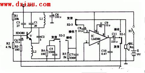 。三極管V和電感線圈L1、電容器C1、C2等組成電容三點式振蕩電路,產生頻率約為100MHz的載頻信號。集成功放電路LM386和電容器C8、C9、C10、Cll等組成低頻放大電路。揚聲器BL