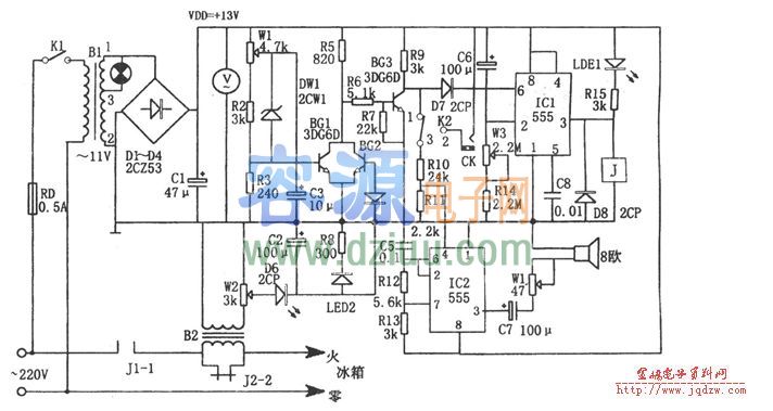 過壓、欠壓和過流檢測、開關電路由W1、R2、R3、DW1、BG1、BG2、BG3等組成。當發生過壓、欠壓或過流時,BG3截止,其集電極為高電位,該電位的一路加至IC1⑥腳,使555復位,③腳輸出的低電平使繼電器J釋放,觸點J2-2斷開,切斷冰箱電源,