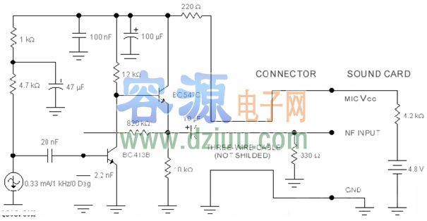 都有一個麥克風(fēng)輸入、揚(yáng)聲器輸出、線路輸入和輸出。麥克風(fēng)輸入設(shè)計的動態(tài)阻抗話筒只在200~600歐的范圍。拉扎爾已經(jīng)適應(yīng)聲卡使用一個共同的駐極體麥克風(fēng)使用這種電路。他提出了一個復(fù)合放大器使用兩個晶體管。 <<版權(quán)聲明:本文由容源電子網(wǎng)(www_dziuu_com)整理提供,部分內(nèi)容來源于網(wǎng)絡(luò),如有侵犯到你的權(quán)利請與我們聯(lián)系更正。》