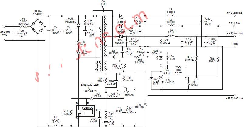 TOPSwitch-GX用電流模式反饋來取得極低的空載功耗。C16、R1和Q2給TOPSwitch-GX的控制腳提供一個恒定的電流。R2把Q2的剩余電流饋入M腳,饋入電流