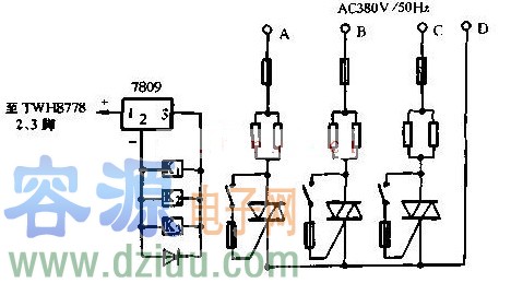 今天為大家介紹的是一款采用三相交流電供電的大型電孵器的電路。主要電路圖如下所示,三端穩壓器7809輸出端接三只繼電器,用來控制三相電源中3只VS電熱絲功率不小于10KW.塑封的7809需加