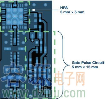 對一個代表性布局做了尺寸研究,如圖6所示。柵極脈沖電路的運算放大器部分放置在通向HPA輸入的RF路徑附近。精密DAC未顯示出來,假定其放置在控制部分中,為多個發射通道提供輸入。布局研究表明,可將該電路添加到實際的低成本PWB實現方案中,發射RF電路所需的額外空間極小。