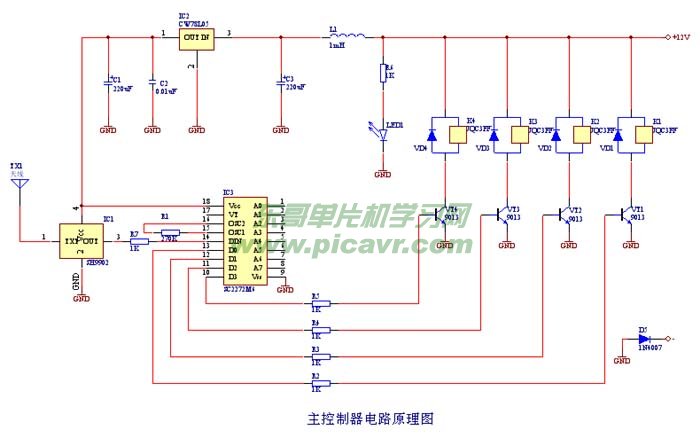 英文翻譯結(jié)果:電路圖如圖1所示。由電路,無線接收部分主要供應(yīng)的一部分,數(shù)據(jù)解碼部分和開關(guān)控制元件。直流12V電源輸入接收器,一路到繼電器電源供應(yīng),以及其他通過三端穩(wěn)壓器調(diào)節(jié),在5V工作電壓的輸出,作為無線接收器和解碼部分的電源部分。