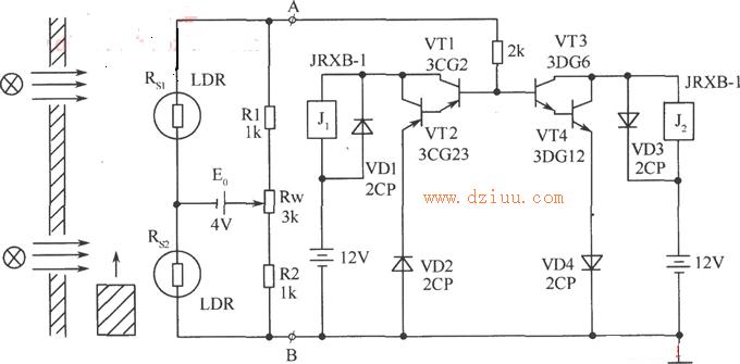 遮光或光照,調節(jié)Rw,使電橋平衡。UAB=0V。測量時,當物體由下向上運動時,Rs2首先被遮光,阻值增大,Rs1被光照,阻值較小,電橋失衡,UA>UB,UAB>0V,則VT1、VT2截止,VT3、VT4導通,繼電器J1保持斷開