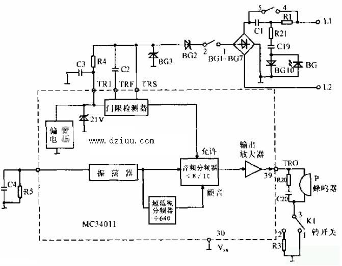 本電路只是普通電話機振鈴電路,電路的工作原理也很簡單,從,圖中可以看出,由L1和L2發來的載波信號,經橋式整流后送入MC3401的振鈴信號