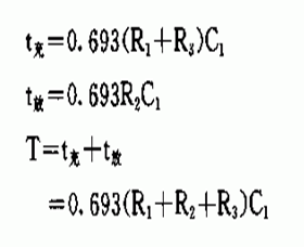 由汽車電瓶供電,兩塊555集成電路構成的變音振蕩器和音頻功放組成。IC1、R1、R2、R3、C1、D1、D2等組成無穩態多諧振蕩器電路,頻率由電路的充電時間T充和放電時間T放決定。