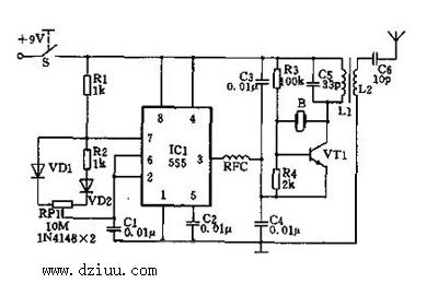 工作可靠。VT1振蕩產生的高頻載波經555電路③腳的方波信號調制,由天線發射出去。