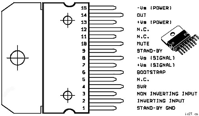 TDA7294廣泛用于Hi-Fi領域,如家庭影院、有源音箱。該器件為15腳封裝,外形如圖