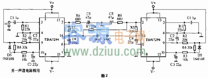 OCL電路圖見圖1,本電路是用兩片TDA7294組成的雙聲道70W 功放。外圍元件少,電路簡單,當電源電壓為土35V時,在8歐負載上可獲得70W的連續輸出功率。非常適合30平方米以下的環境放音。整流電路見圖4,如音箱阻抗小于8歐,電源電壓應相應降低。 <<版權聲明:本文由容源電子網(www_dziuu_com)整理提供,部分內容來源于網絡,如有侵犯到你的權利請與我們聯系更正。》