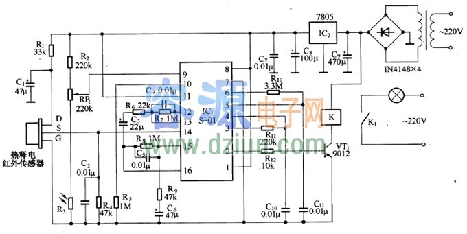 再出現(xiàn)第二次觸發(fā),則延時(shí)重新開始,以保持燈亮。要是現(xiàn)場有人一直停留而不離去,燈光就會(huì)持續(xù)點(diǎn)亮而不熄滅。 <<版權(quán)聲明:本文由容源電子網(wǎng)(www_dziuu_com)整理提供,部分內(nèi)容來源于網(wǎng)絡(luò),如有侵犯到你的權(quán)利請與我們聯(lián)系更正。》