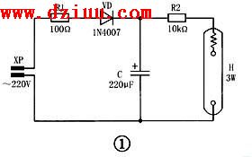 。H是小功率冷陰極低壓熒光燈。當(dāng)電路接入電網(wǎng)后,220V交流市電經(jīng)電阻器R1限流、晶體二極管VD半波整流后,將電容器C兩端電壓充至290V左右,