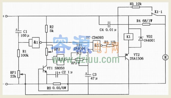 防止電機在啟動時產生的大電流造成電路的誤動作,由Cl、Rl、RPl及與非門l組成了開機保護延時電路。電機開始啟動時,Cl上無電壓,