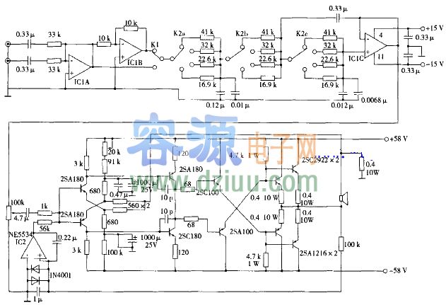 由三聯波段開關K2和IC1C構成的線路是以巴特沃斯三階低通濾波器組成的約40 Hz,55 Hz,75 Hz,100 Hz共4個低頻輸入截止點。 <<容源電子網論壇正式上線,為朋友們建立一個友好互動交流平臺,歡迎大家去論壇和朋友們一起分享、學習電子技術。對本文有什么疑問請直接到論壇相應欄目發貼求助。