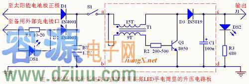 太陽能供電板的電路如圖1所示。由D1、BT構成系統的太陽能充電電路。平時,只要達到一定光強,太陽能電池板便通過二極管D1為充電電池BT充電,直至飽和。除了太陽能充電方式外,我還設計了備用的外部直流電源充電接口以防不時之需。外部充電電路由R1、DS1、D2、BT構成,R1選用功率為1W的電阻,當R1為10歐姆的時候,最佳外部充電電壓為3-4伏,DS1為外部充電指示燈,它是利用電阻R1上的壓降來點亮的。后面的升壓電路是運用間歇振蕩器的快速關斷(截止)的特性而實現升壓的。S1為供電開關,當S1閉合后升壓電路開始工作,太陽能供電板便可驅動負載,J1為輸出接口,DS2是輸出指示燈。