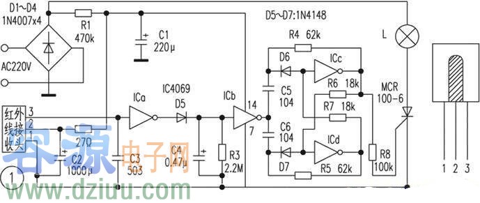 4069簡易紅外遙控開關(guān)電路圖。現(xiàn)在家庭中TV、VCD、VCR等紅外遙控發(fā)射器擁有量較普遍,本電路針對(duì)它們的性能而構(gòu)思,使遙控發(fā)射器發(fā)揮另一用途:發(fā)射紅外信號(hào),控制照明燈具,其控制距離
