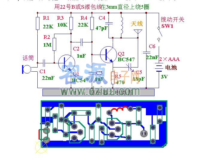 的范圍。 電路工作原理 從圖(1)電路可見分兩級,一級音頻放大器和一級RF振蕩器。 駐極體話筒內