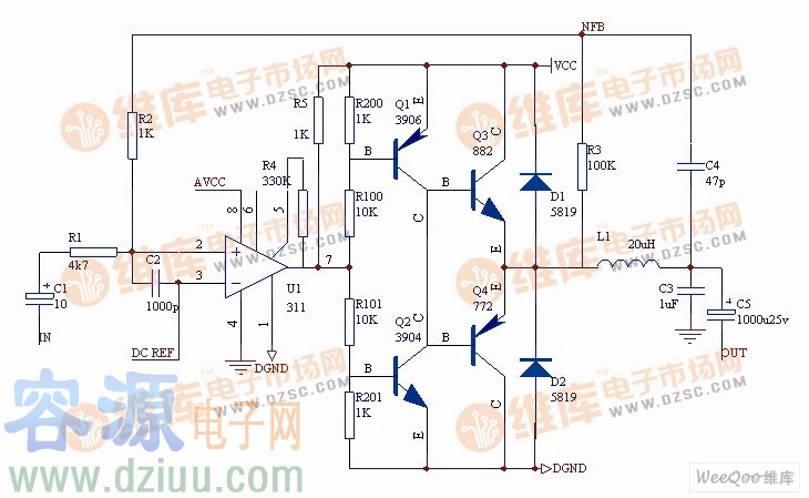電源電壓:單電源9~24VDC(更高的沒試過)。 輸出功率:24V時在4.3歐測試負載上最大可達10W,此時功耗約14W。 空載電流:40mA(12V),100mA(24V)! ≈C波失真:1KHz帶4.3歐測試負載,諧波失真成份主要是二