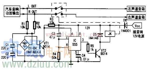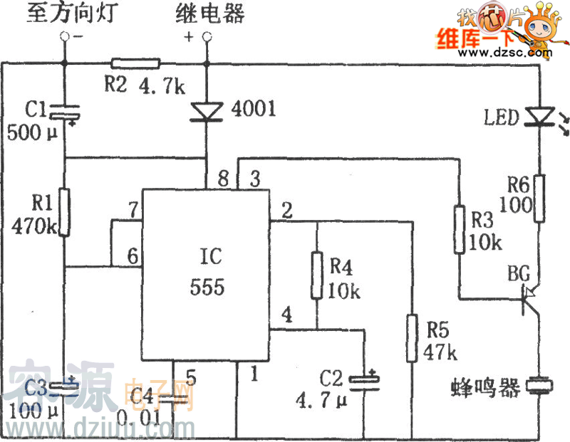 該電路由單穩延時電路、驅動電路、蜂鳴器、發光二極管等組成。其中由555和R1、C3組成的單穩延時電路的輸出信號控制后面電路的工作。 開燈后電路中來自方向燈繼電器的電源通過二極管加至555 ⑧腳,使電容器C3