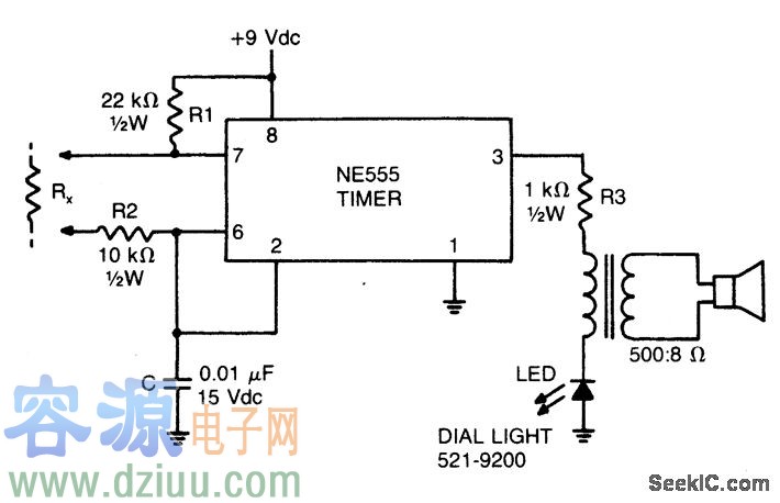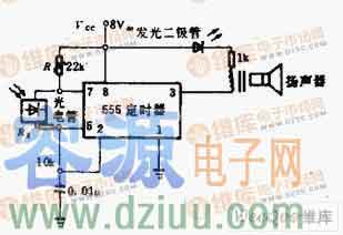由555組成的感光式振蕩電路 如圖為由555組成的感光式振蕩電路。該電路用于探測閃電,可供盲人用作光雷達和報曉器等。555定時器的振蕩頻率隨光強度的增加而成正比例增加。當它工作在自由振