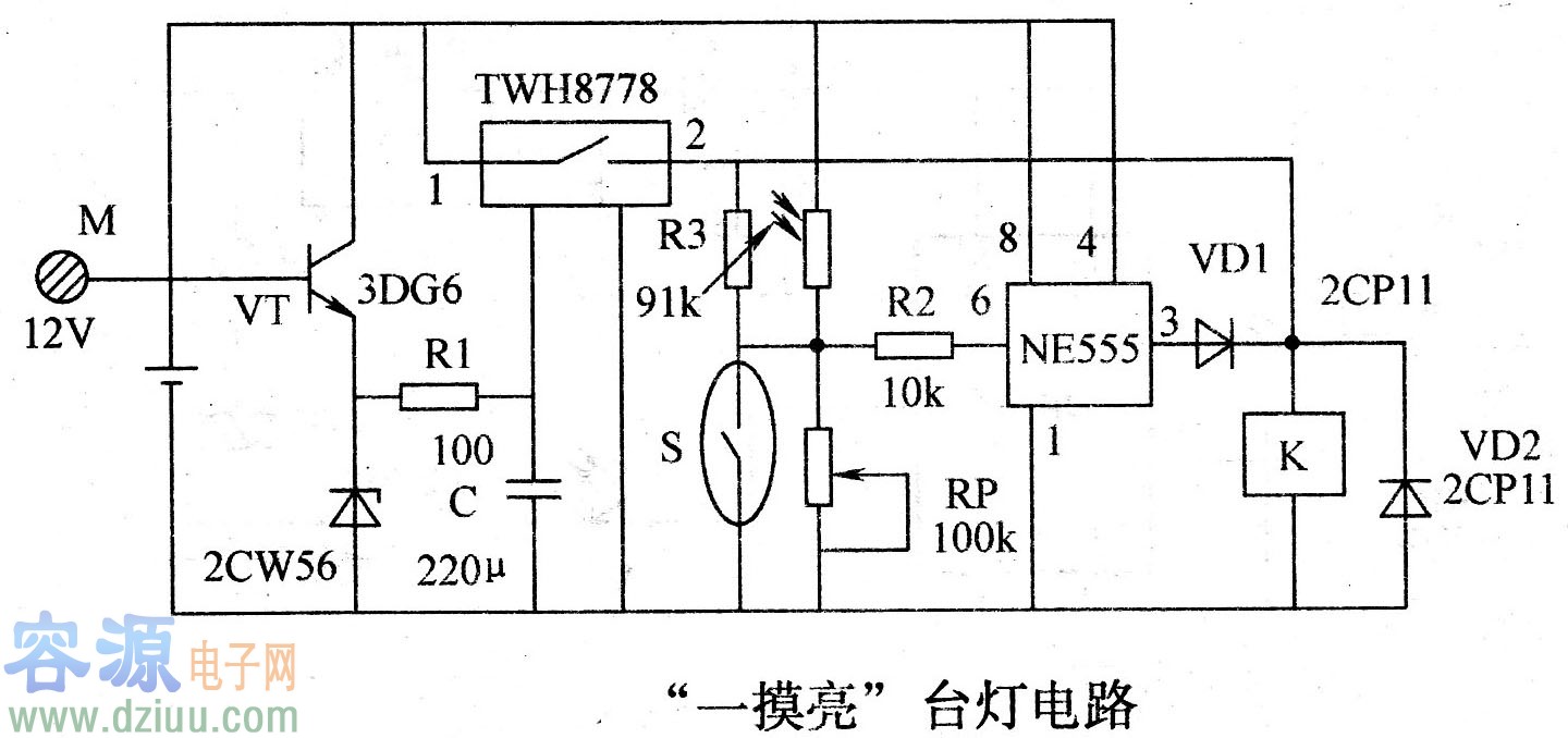 這是一種人體感應燈,人手觸摸臺燈金屬部分時燈亮,而且一直亮下去,因此又叫“一摸亮”臺燈。當想關掉燈時,再一次觸摸臺燈金屬部分即可關掉,非常方便。 人體所發出的電信號頻率范