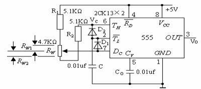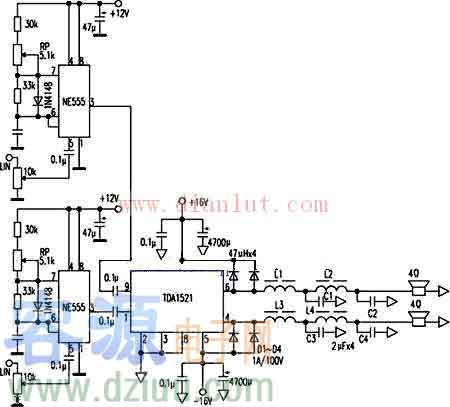 NE555時基IC被接成振蕩頻率120KHz、占空比50%的方波振蕩器。由于IC都是工作于開關狀態,因而可以高效率地輸出大功率。音頻信號由5腳輸入時,3腳的輸出信號占空比就會隨著輸入音頻信號的幅值高低而作線性