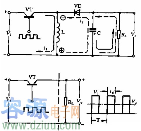 下圖中所采用電感L、電容C和負載RL并聯的工作方式。當開關管VT導通時,二極管Ⅷ反偏截止,輸入電壓vi只對電感L儲能。這時負載RL上的電流是由前幾個周期已充了電的電容C放電供給,電流方