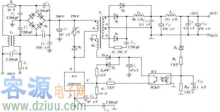 電路如圖所示,該電路可以獲得更大的輸出功率,只需更改部分器件。圖中左邊的電路 R1,L1,D1,C1至C7是常規的共模濾波和整流電路,獲取約300 V的直流電壓供DC-DC變換電路使用;最右邊電路