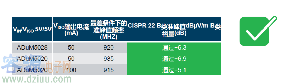 ADI新一代isoPower系列產品 新一代isoPower系列產品采用創新的設計技術,可以避免產生大量輻射發射,甚至在沒有旁路電容的2層板上也不例外。ADuM5020和ADuM5028在以大幅裕量滿足CISPR22/EN55022B類限制的同時,可以分別跨隔離柵提供500mW和330mW功率。