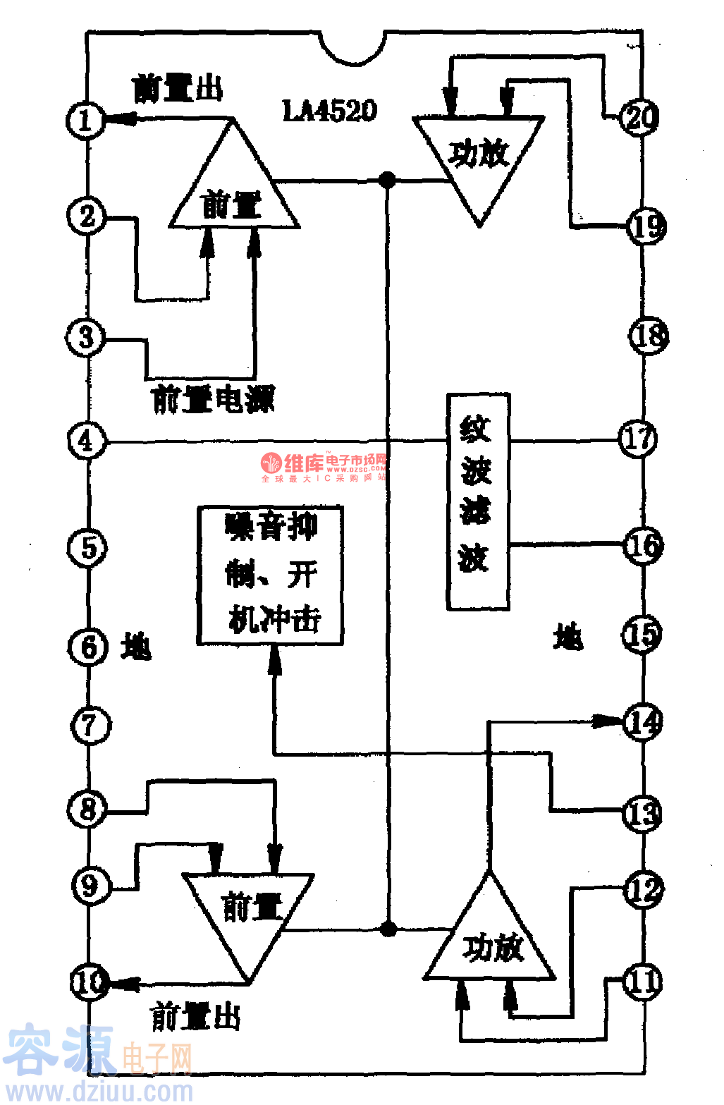 LA4570是日本三洋公司推出的放音機專用集成電路。國產、國內組裝或進口的單放機及收放機中,都應用LA4570的機型。 1·以4570內電路方框圖及引腳功能 LA4570集成塊是雙前置放大雙功放器件,具有電源電壓
